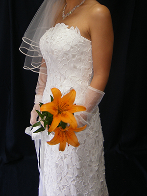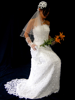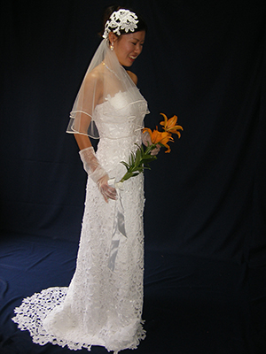 高級感のあるケミカルレースを、大人なイメージでストレートラインに近いAラインでお仕立てしました。ケミカルレースの特性をいかして、重ね接ぎを全て手縫いで行い、縫い目のない綺麗なシルエットを作り出しています。ケミカルレースの美しさを見て頂けるように、後ろのトレーンはあえてケミカルレースのみにデザインいたしました。エキゾチック感を出すために、ヘッドドレスにも同じケミカルレースを使いました。