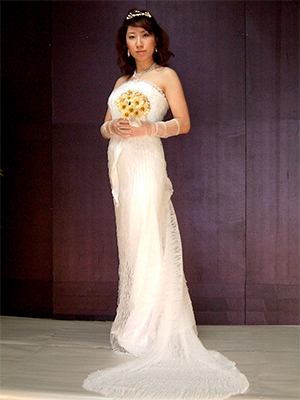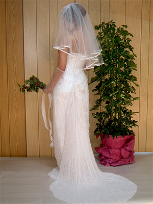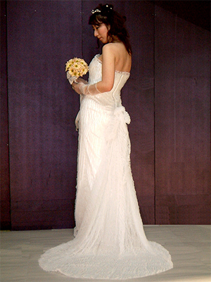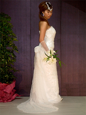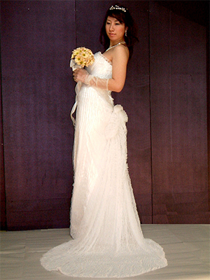 ストレッチチュールに、立体的な縦のひだが全面的に入った生地を使用してドレスをお仕立ていたしました。ストレッチ性がありとても着やすいドレスになっております。生地の表面効果に特徴があるため、この生地に合わせてデザインはシンプルに、ストレートラインにいたしました。後ろのトレーンの始まりにふくらみを持たせて、そこをデザインポイントといたしました。縦に長いシルエットのドレスでしたので、ヘッドドレスも工夫させて頂きました。
