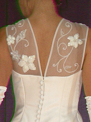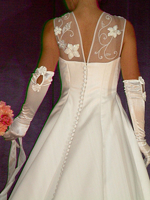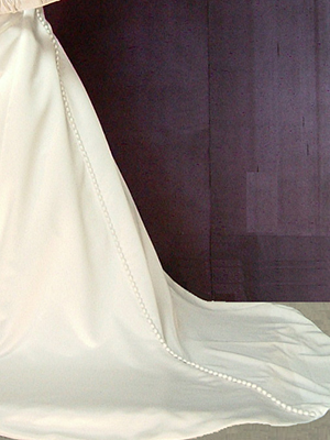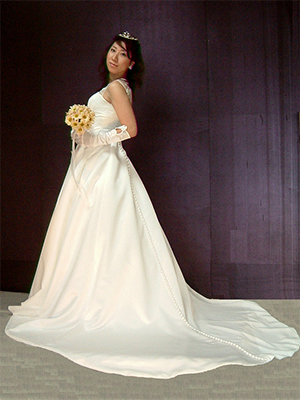 ベアトップの上の部分は、透明感のあるオーガンディーにスパンコールとビーズでハンド刺繡をほどこしました。刺繍のデザインも私がさせて頂き、とても楽しかった思い出がございます。ハンド刺繡の豪華さに負けないように、下の部分は上品で高級感のあるブライダルサテンの生地を使用して、Aラインにお仕立ていたしました。後ろ中心にはクルミ釦(ボタン)を、一列すべてに付けさせていただきました。優しさもありながら、品のあるドレスになりました。