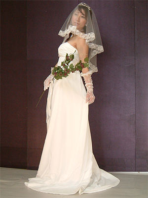 ギリシャ神話に出てくるようなドレスをイメージして、この生地にとても良く合う、ジョセフィーヌラインのドレスをデザインしました