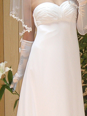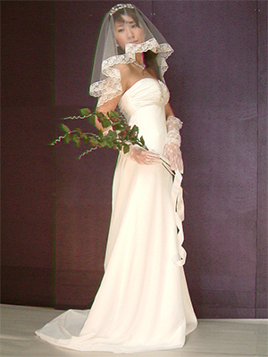 とろんと垂れ感のある、ジョーゼットの生地を使用してお仕立ていたしました。ギリシャ神話に出てくるようなドレスのイメージで、この生地にとても良く合う、ジョセフィーヌラインを選びました。胸元にたくさんの細かなドレープをほどこし、とても品があり凛としたたたずまいのドレスになりました。