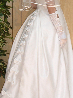ウエストはほっそりとすそに向かって幸せのリボンが並ぶエレガントで豪華なバッスルスタイルのドレス