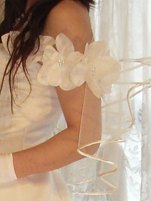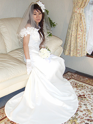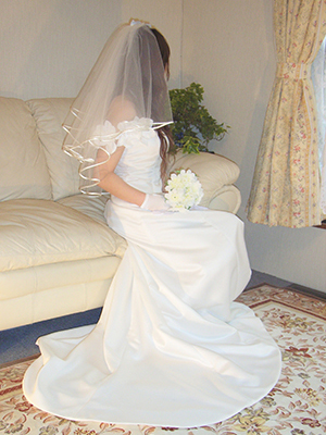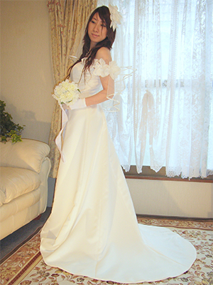 上品な光沢と厚みがある、しっかりとした織りで高級感のあるブライダルサテンを使用してお仕立ていたしました。お袖(そで)には可愛いお花をお付けして、ヘッドドレスにも同じお花をお付けして、統一感を出しました。シンプルなドレスですが、しっかりとした厚みのある生地でお仕立てしているため、存在感のあるドレスになっております。