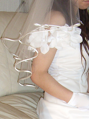 ヴェールの端には、ブライダルサテンの細いパイピングをほどこして