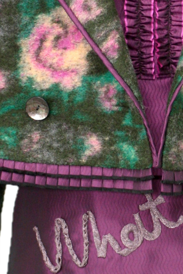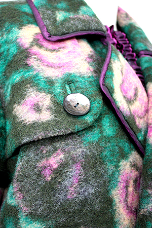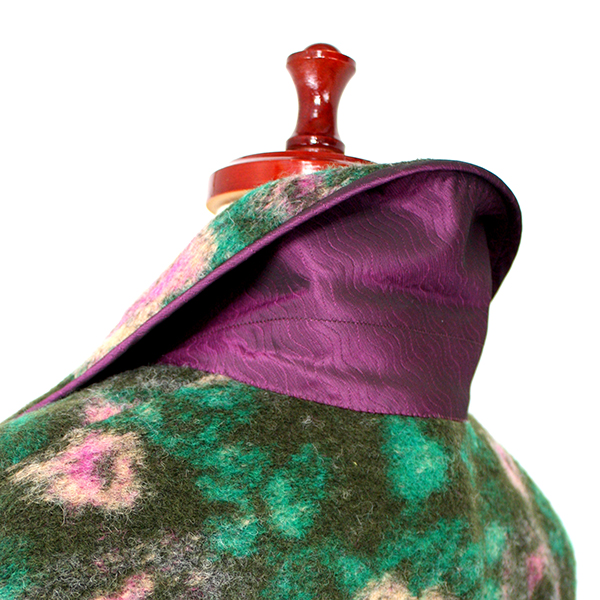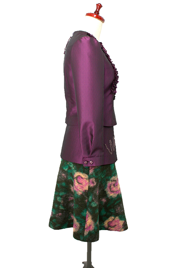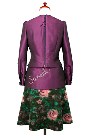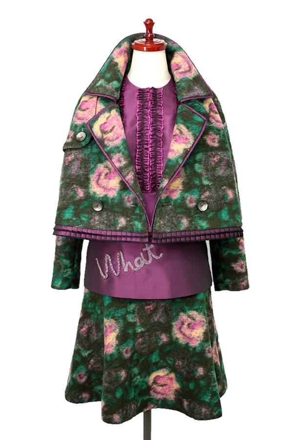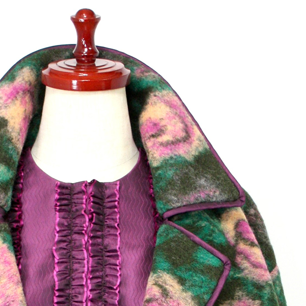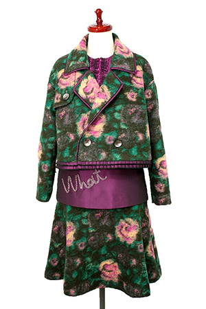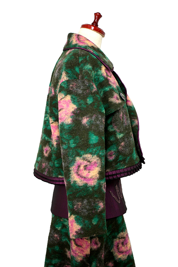 3着目はグリーン×ピンクのフェルトの生地で、お客様の色彩感覚でボルドーの生地をブラウスやジャケット、スカートのディテール部分にお選びになられました。本当に素晴らしい色彩感覚をお持ちで、コレクションの洋服を思い出させて頂きました。