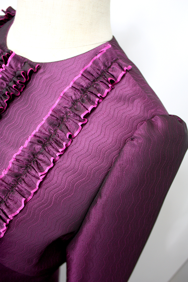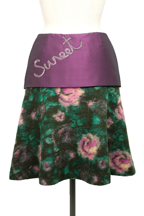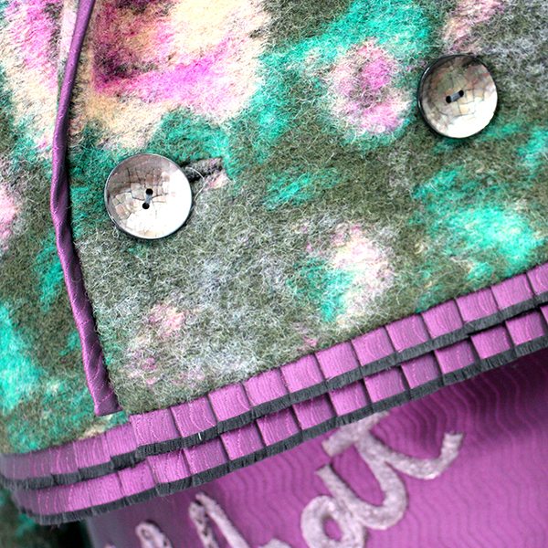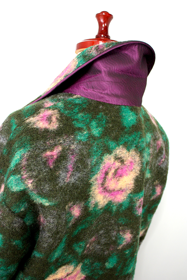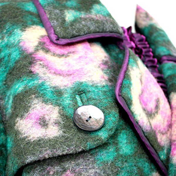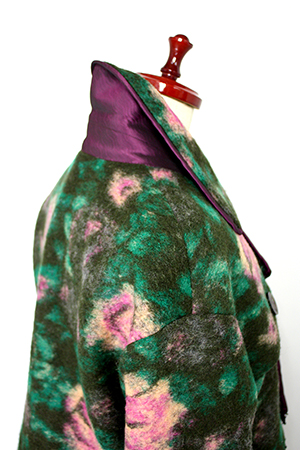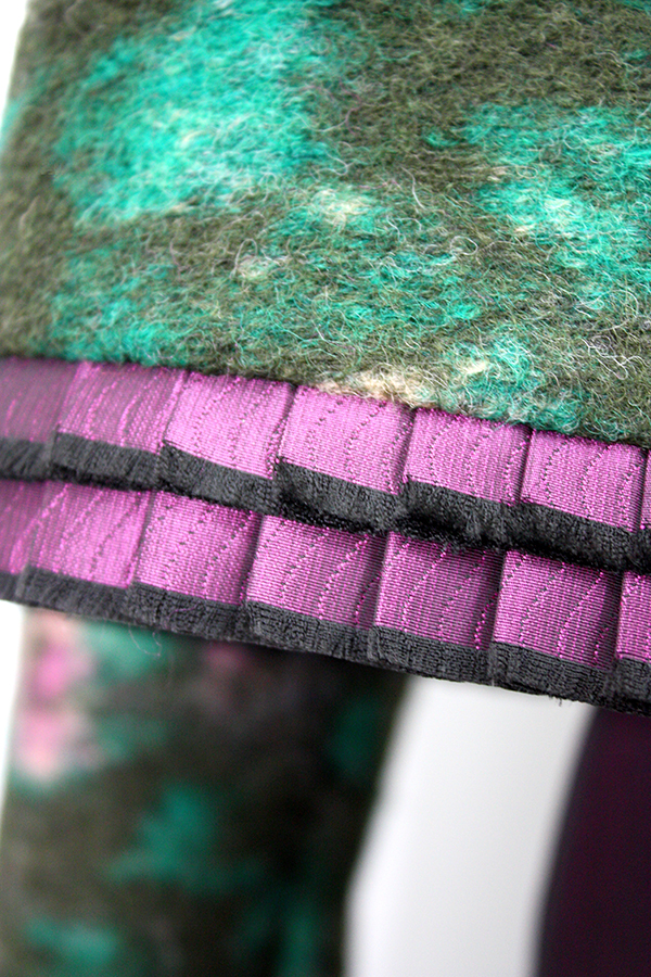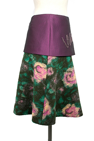 3着目はグリーン×ピンクのフェルトの生地で、お客様の色彩感覚でボルドーの生地をブラウスやジャケット、スカートのディテール部分にお選びになられました。本当に素晴らしい色彩感覚をお持ちで、コレクションの洋服を思い出させて頂きました。