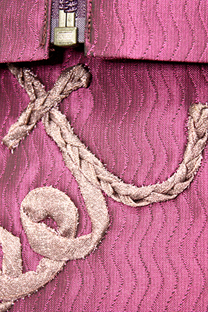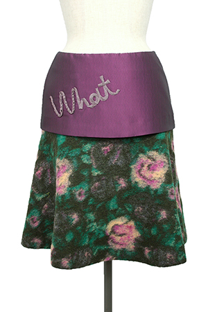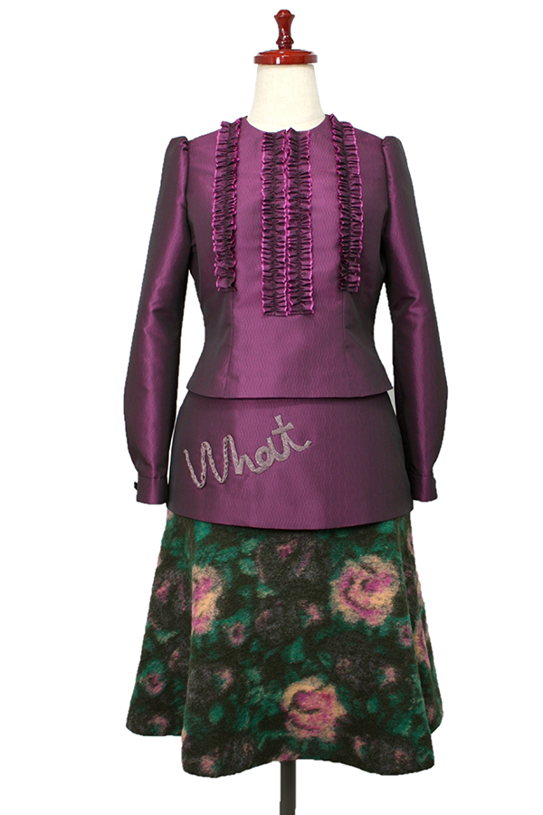 お客様のご要望は、スカートに布地で字を作って欲しいということと、ジャケットの裾に二段の1cm感覚のプリーツを作って欲しいということでした。とても斬新で素敵なアイデアですよね。