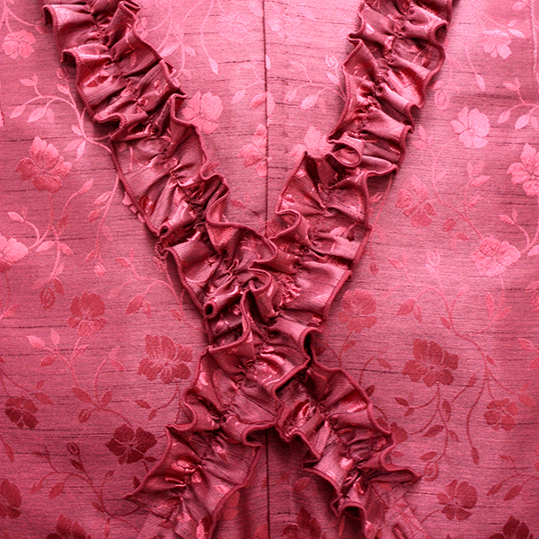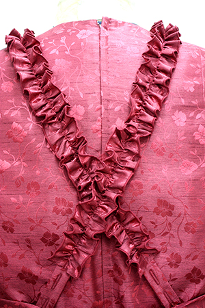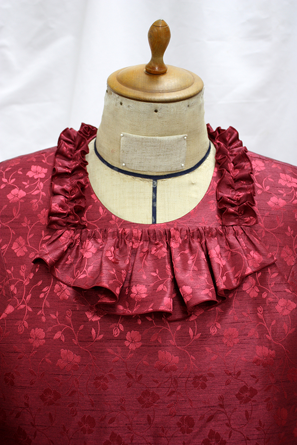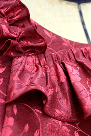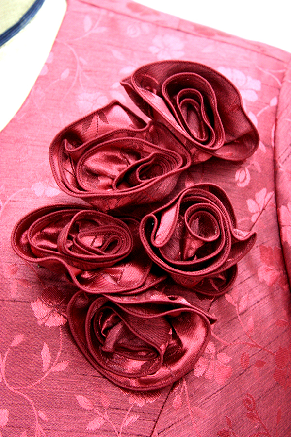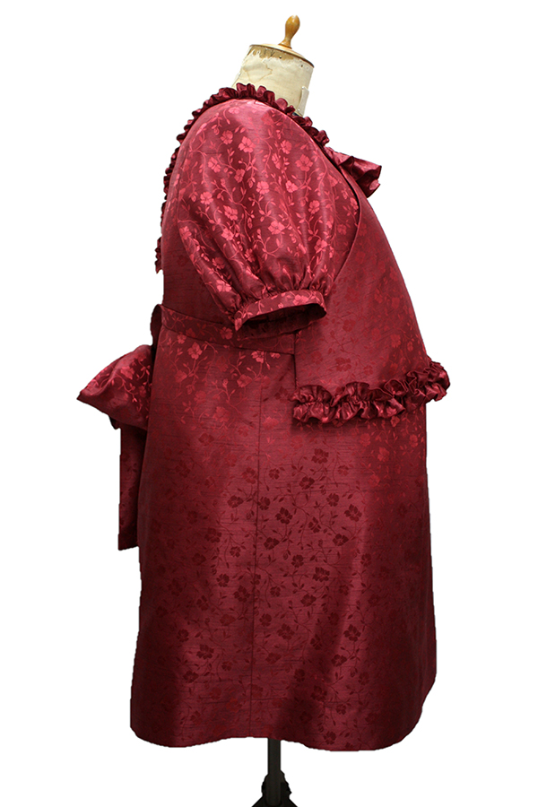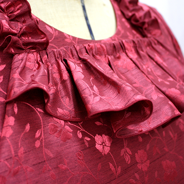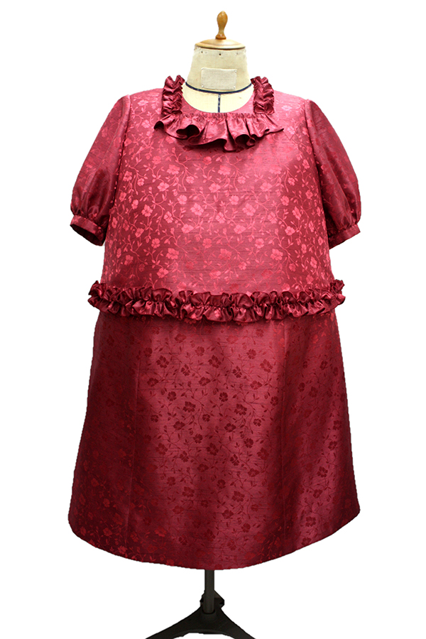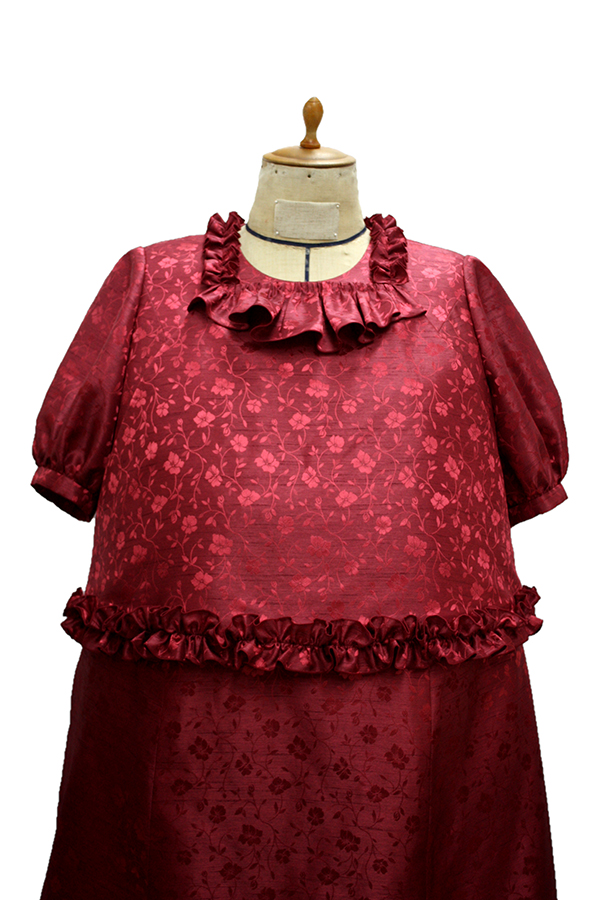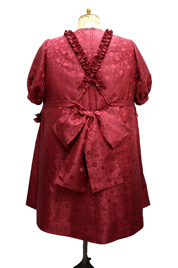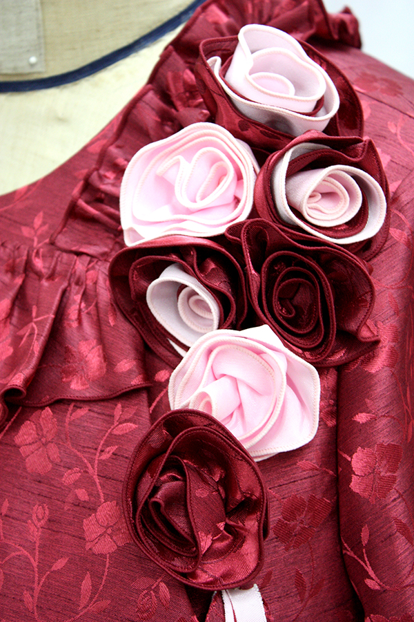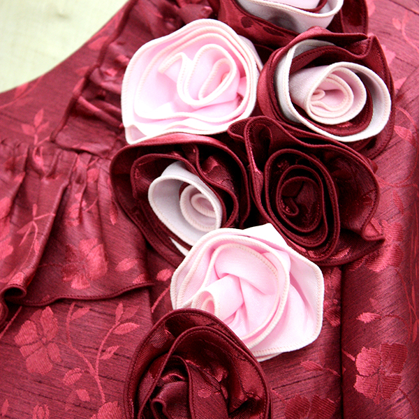 お仮縫いをさせて頂くうちに、お母様のアイデアで、ドレスと同じ生地でフリルをたくさん付けたエプロンをお仕立てすることになりました。こちらのエプロンが本当にお嬢様の雰囲気によくお似合いで、まるでドレスに合わせたジャケットかボレロのように見えて、今のお若いご年齢から、今回はこのエプロンをご着用のまま写真撮影をすることになったので、このドレスの為にお作りした沢山のお花をエプロンやドレスの上につけてお納めさせて頂きました。あまりの可愛さに、お嬢様の目がまん丸になられていたのが印象的でした。
