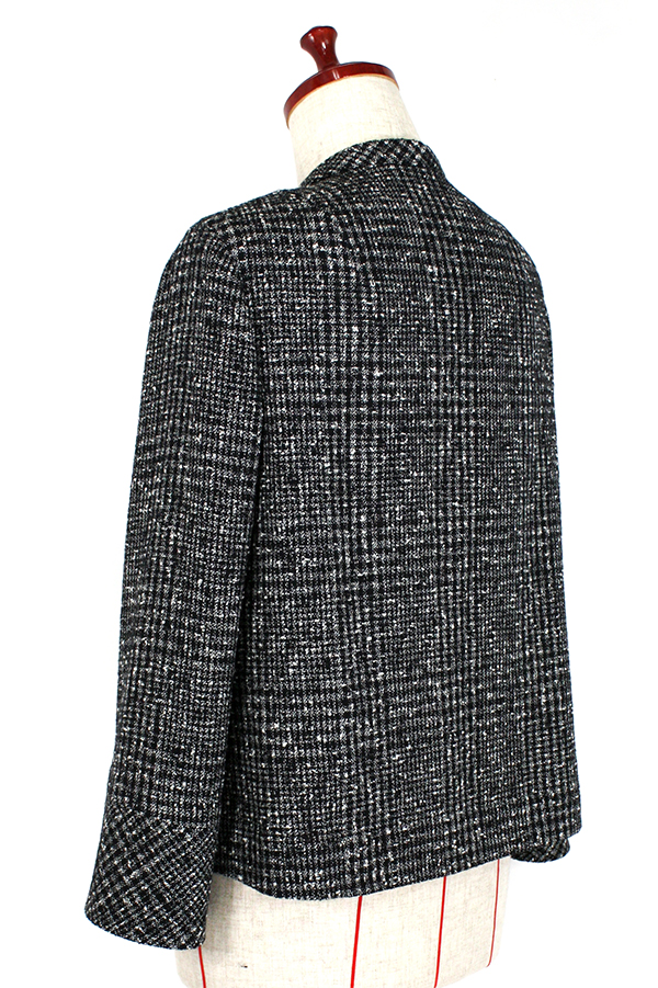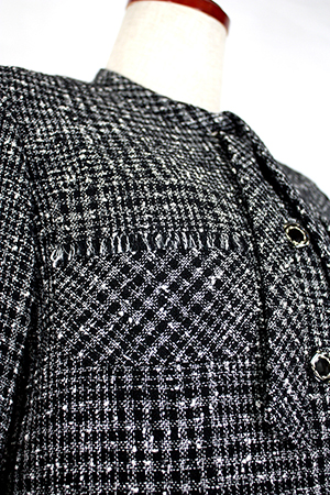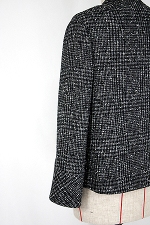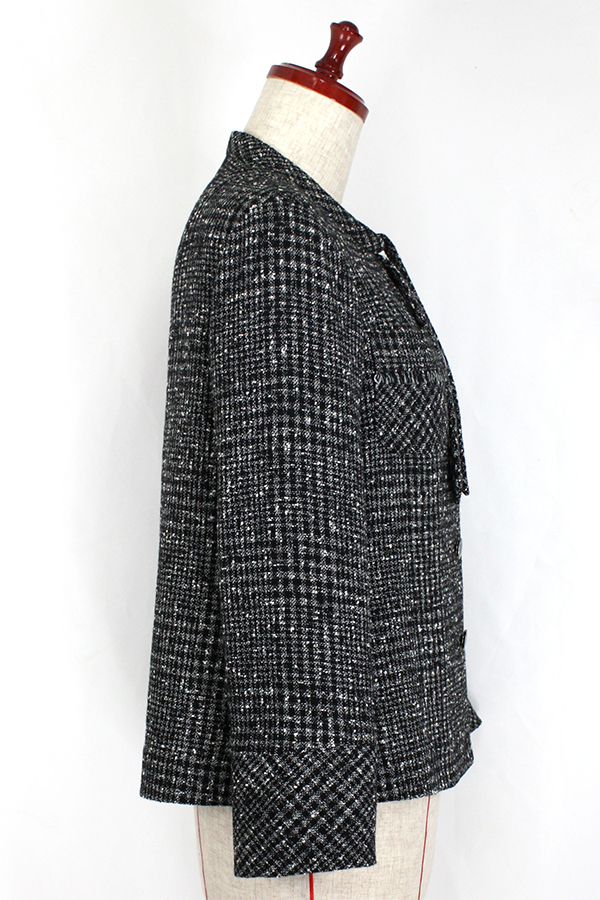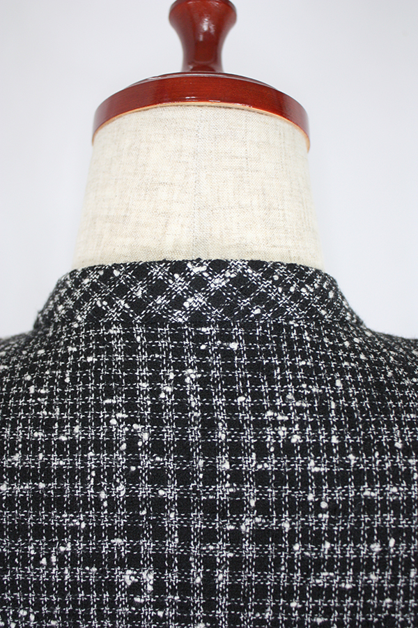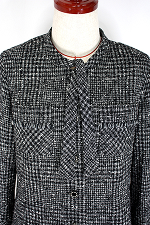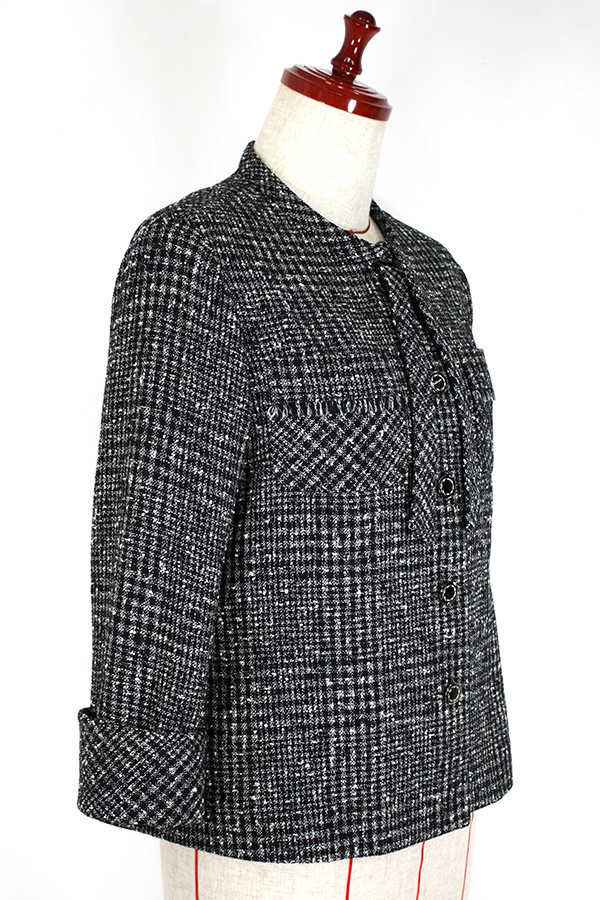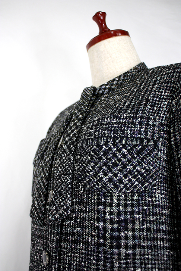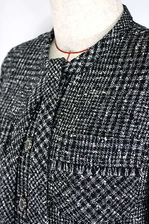 お衿(えり)はタイカラーでバイアス仕立て。フリンジをほどこしたアウトポケットは縦地とバイアスを組み合わせ、袖(そで)口の幅広のカフスもバイアス仕立てで、さりげなくこのグレンチェックのツイードの生地を活かした、素敵なデザインになっております。肩線は少しだけドロップして、肩の丸みを優しい雰囲気で表現いたしました。
