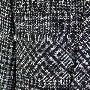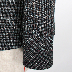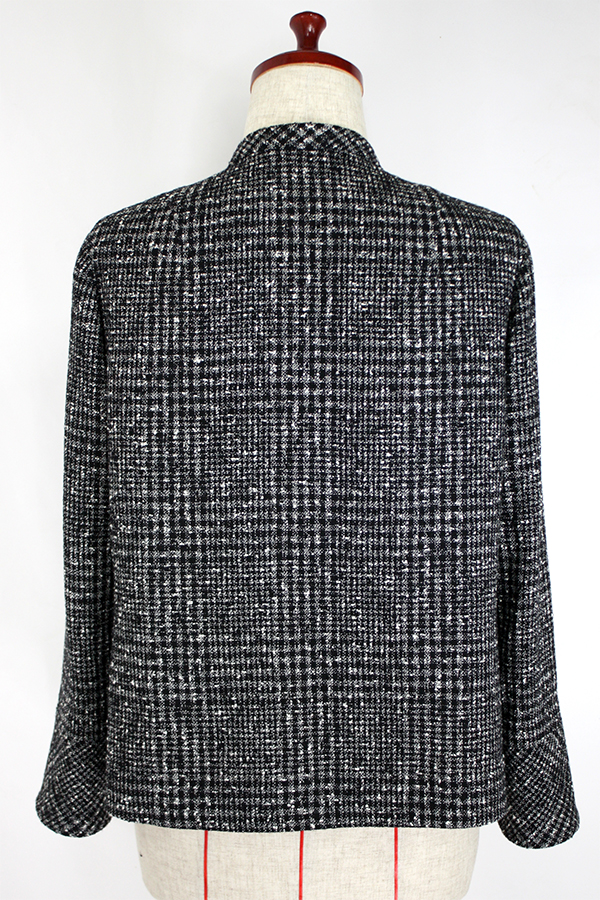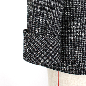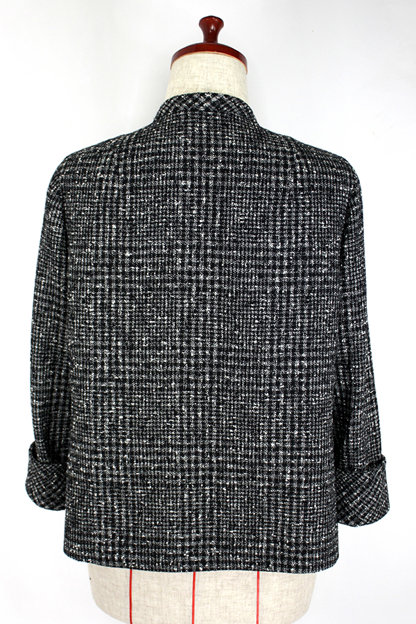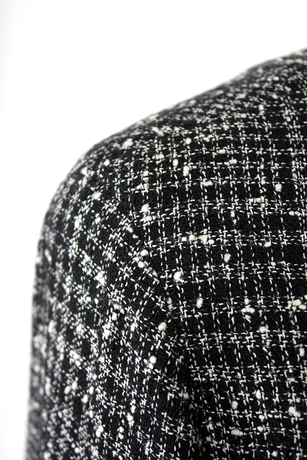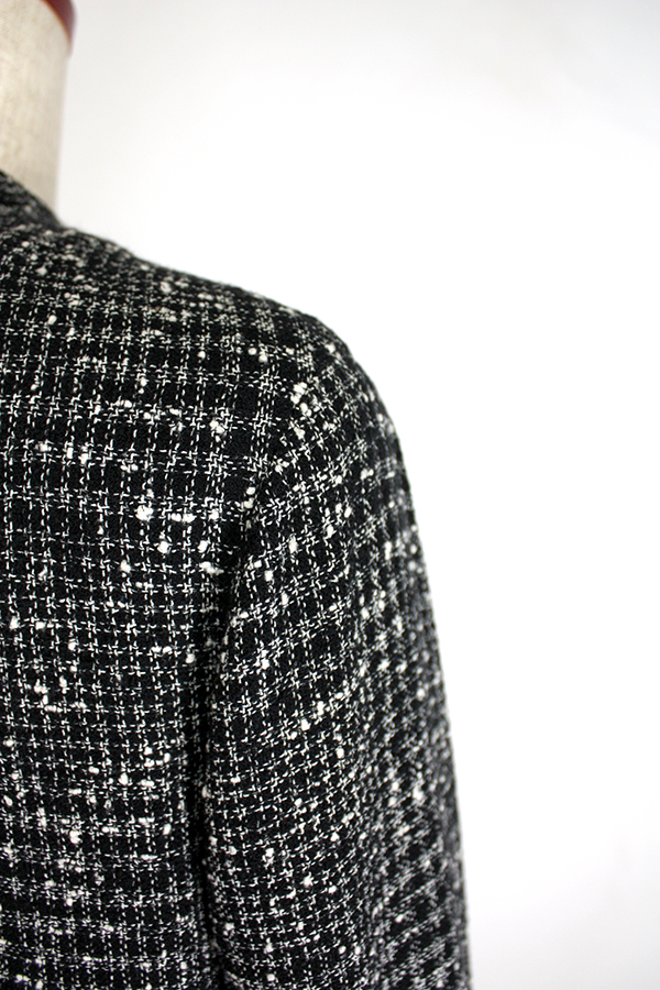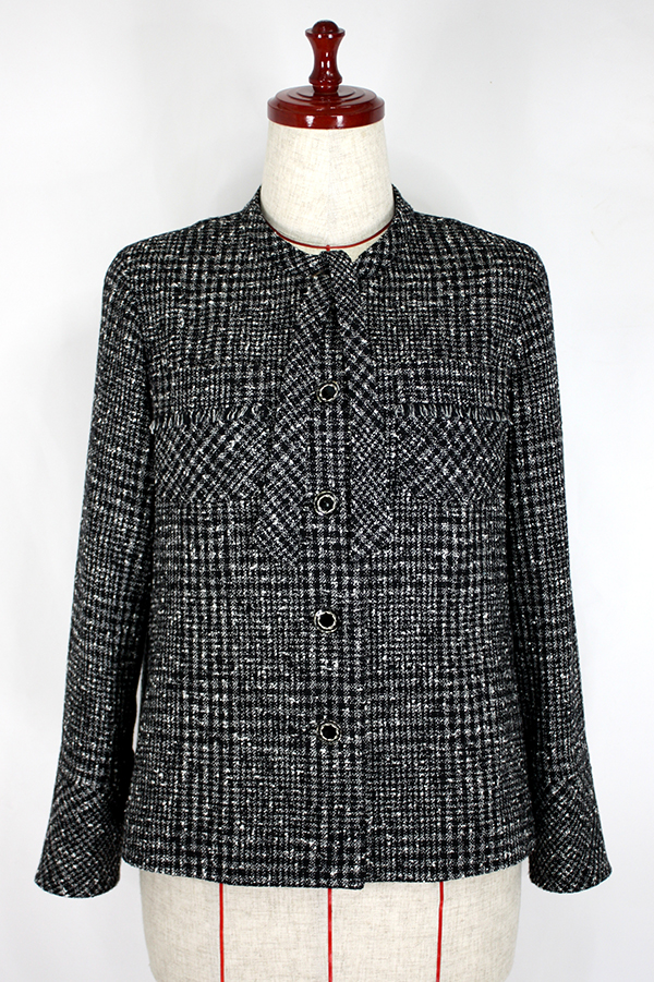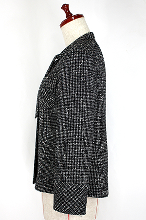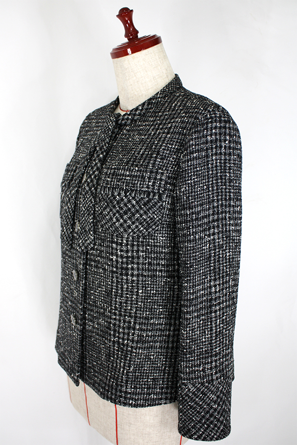 お衿(えり)はタイカラーでバイアス仕立て。フリンジをほどこしたアウトポケットは縦地とバイアスを組み合わせ、袖(そで)口の幅広のカフスもバイアス仕立てで、さりげなくこのグレンチェックのツイードの生地を活かした、素敵なデザインになっております。肩線は少しだけドロップして、肩の丸みを優しい雰囲気で表現いたしました。
