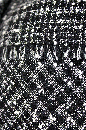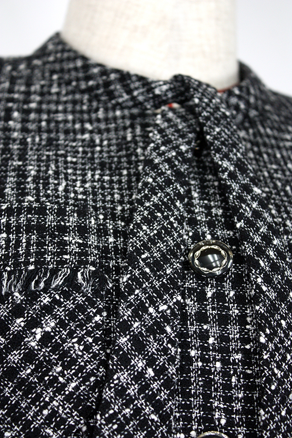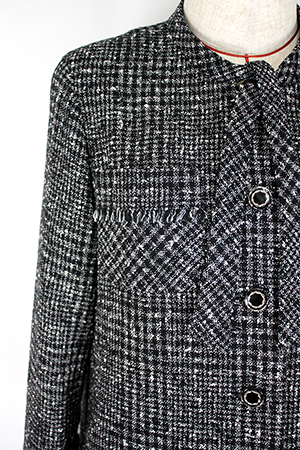 ツイードのグレンチェックの柄をいかして、タイカラーやポケットをバイアス仕立てに