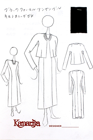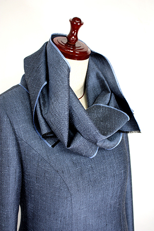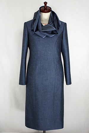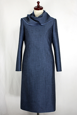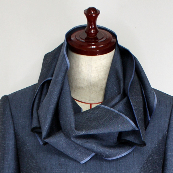 今回のウールシルクのワンピースは、パネルラインのストレートシルエットで、スタンダードでベーシックなデザインでしたので、共布のまわりをフリンジにした長めのストールをおつけして、ストールで色々とアレンジをしてお楽しみ頂けるようにデザインをして、お仕立ていたしました。
