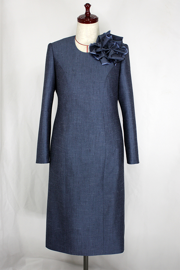 生地に光沢と張りがありとても上品なワンピースなのですが、無地なので「お持ちのブローチをお付けしたら、更に素敵になると思います」と、お伝えしたところ、お客様がブローチが大好きで素敵な物を沢山お持ちだとおっしゃられました。この鉄紺のお色のワンピースには、シルバー・ゴールド・黒・べっ甲など、いろんなお色のブローチがお似合いになると思うので、私もいろいろと想像がふくらみとても嬉しくなりました。ストールとブローチで、さまざまな表情を見せることが出来るワンピースになったと思います。