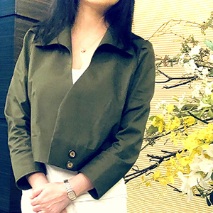 こちらのカーキーのジャケットに合う白のインナーを選ばれて、このジャケットが映えるように、お花の前で撮影されました。素晴らしいセンスですね