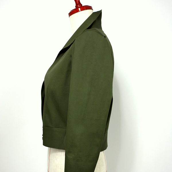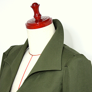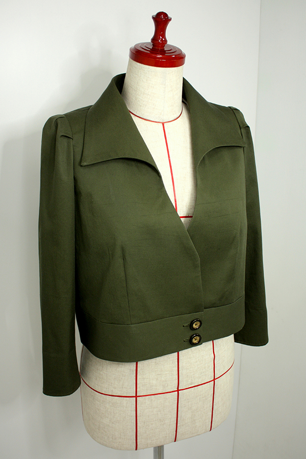 お教室のお休みの日に、ご自宅で練習用にと安い生地(100円/m)で、ワンピースの上の部分を自己流で作ってこられたのですが、手に取ると綿ギャバのしっかりとしたとてもいい生地だったので、練習用にするのはもったいないのでこれでジャケットを作りましょうと、ご提案させて頂きました。1着目の黒×シルバーのワンピースのパターンを基にジャケット用にパターンを変えてお仮縫いをし、お袖(そで)も今の生徒さんの実力に合わせてタックスリーブにしたのですが、これがまた生徒さんやこの洋服の雰囲気にピッタリあって、いろんなアイテムに合わせやすい、とてもいいジャケットになりました。